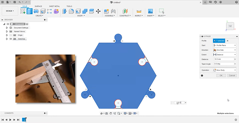 全選草圖中物件的平面造型,點選「Extrude」拉伸工具,並輸入實際加工材料的厚度(小技巧:為確保材料能完美切割,可輸入略大於材質實際厚度的數值;以相同原理使用「Extrude」,可在3D立體物件上繪製其他平面圖型,並增長、內凹成3D立體結構。