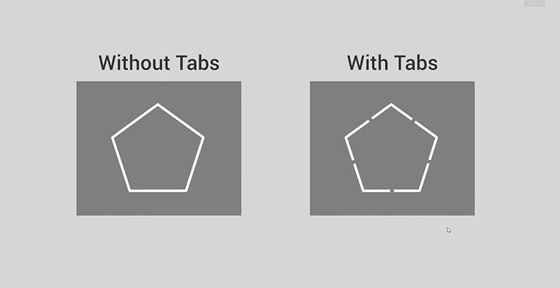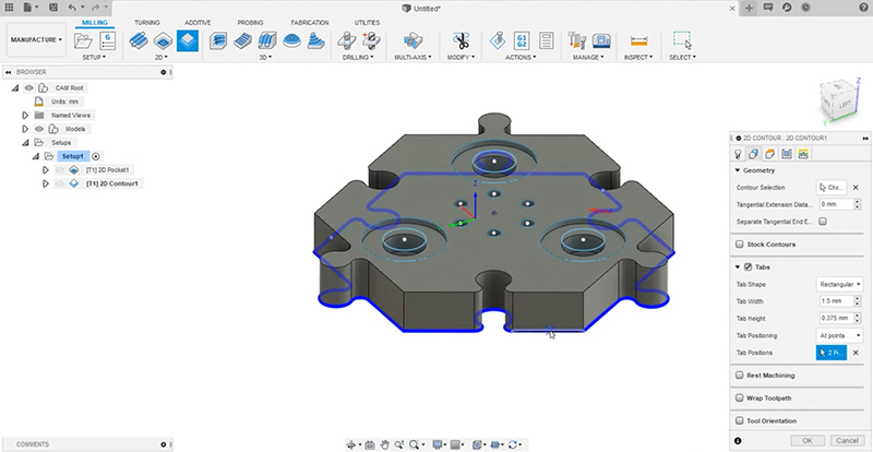 為了避免過程中切割下來的物件,會在工作區域中移動,甚至影響其他在雕刻的結構,在右側工具列中點選「Tabs」功能,可以讓物件在加工過程保持固定。(Tabs>Tab Positioning>At points>使用滑鼠在模型底部輪廓上手動設定)