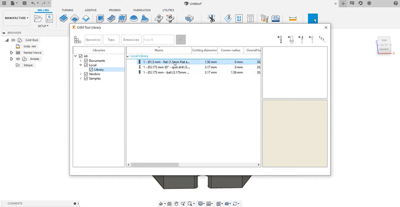 根據所使用的刀頭導入相應的檔案(Tool Library>Local>Library>Import Tool Library)