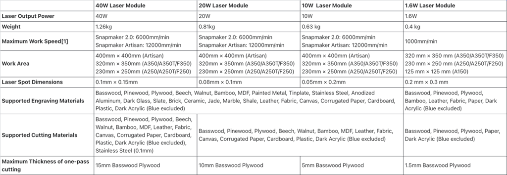 從那時開始,Snapmaker根據技術的允許迅速升級了雷射模組。雷射功率在過去的6年內增加了近200倍,從約5W增加到40W。由於這些升級,支持的材料數量也從約5種增加到20多種。切割能力也大大提高,從幾乎無法切割到能夠切割15mm的楓木薄板。