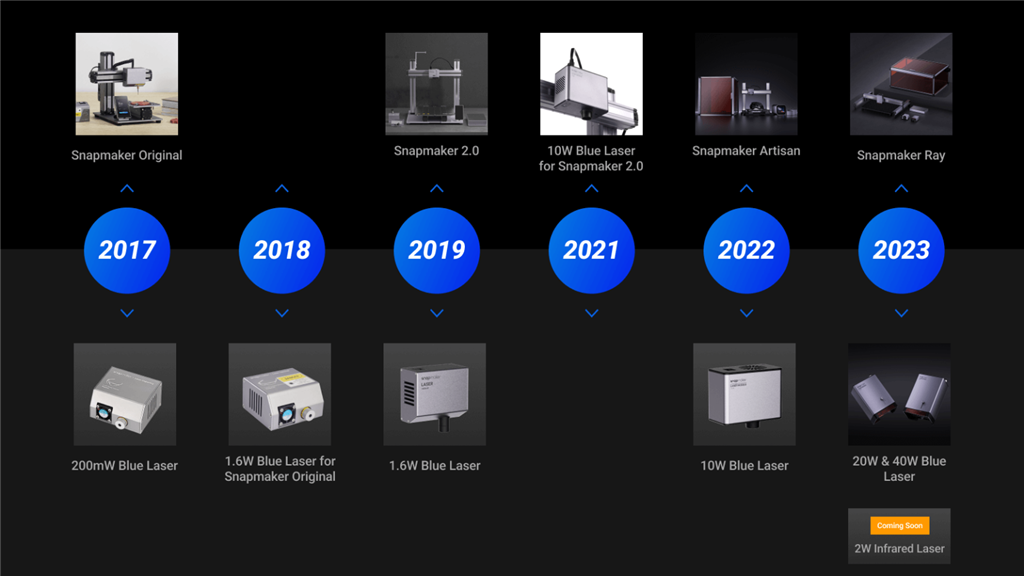 將雷射功能添加到3D列印機的原因是它們的運動機制相似,並且兩者都可以讓有創造力的人迅速處理特定材料。但Snapmaker沒有預料到,這項技術的發展速度比其他兩種技術更快,用戶的需求也在迅速增長。Snapmaker在成功在Kickstarter上籌資後的第一年,即Snapmaker Original成功籌資後,根據用戶反饋,開始進行首次升級。1.6W雷射模組在Snapmaker Original成功籌資後的一年內發布,並在Snapmaker歷史上仍然保持著50%以上的最高重複購買率紀錄。
