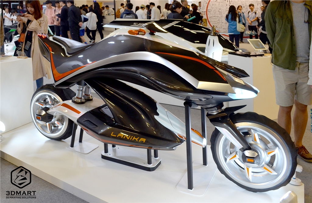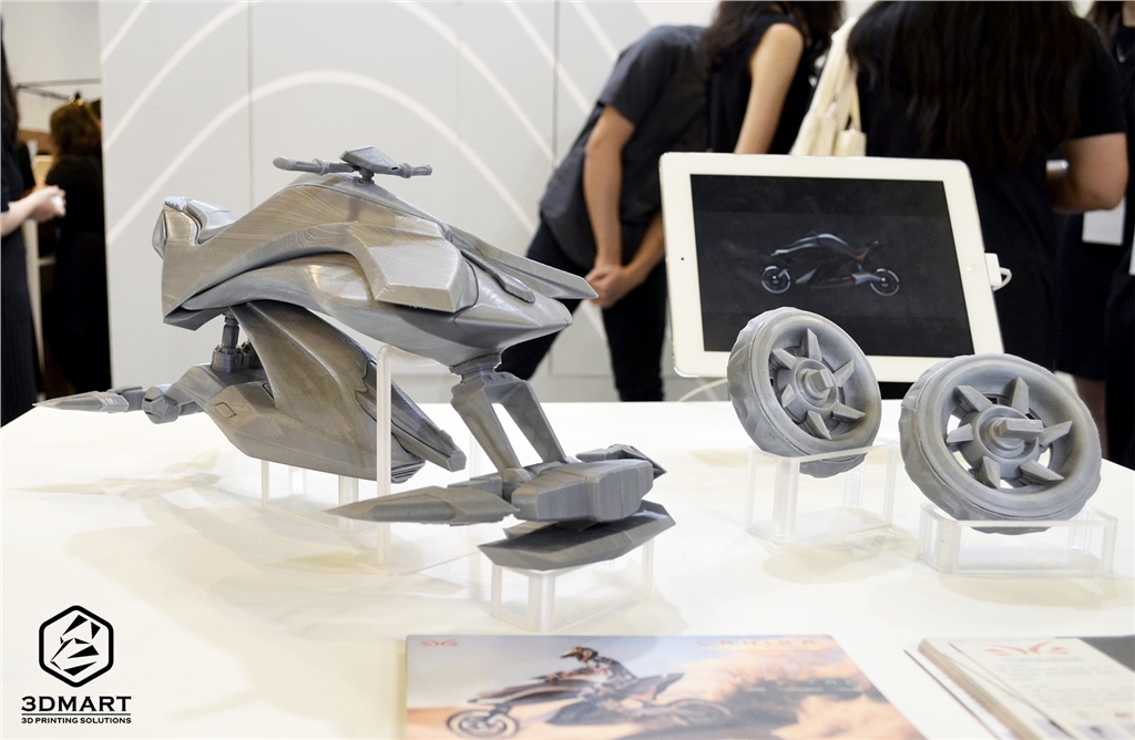 而最令人驚豔的就是超未來的跑車、水上摩托車模型…等,圖中作品的3D列印小模型在一旁可說是小巫見大巫,可以看到應該是用單噴頭3D列印機製作,紋路比較明顯的部分如果使用雙噴頭系統的PVA水溶性支撐,表面會更漂亮。(延伸閱讀:臺灣新創設計力,前進歐洲市場!)