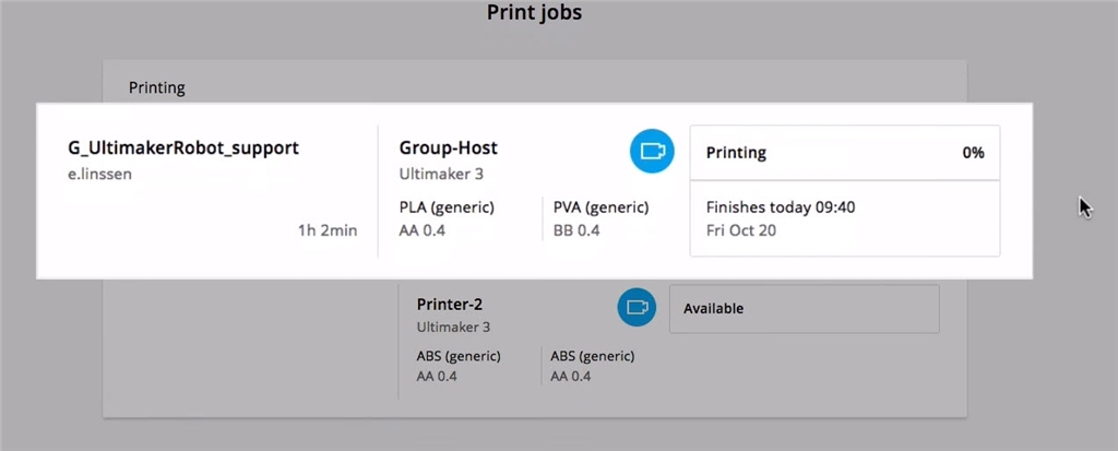 5. 下方「Queued」會(huì)顯示列印中須注意事項(xiàng),以範(fàn)例來說,「Printer-2」列印機(jī)需更換線材,將原本機(jī)器中的ABS線材更換為PLA線材。