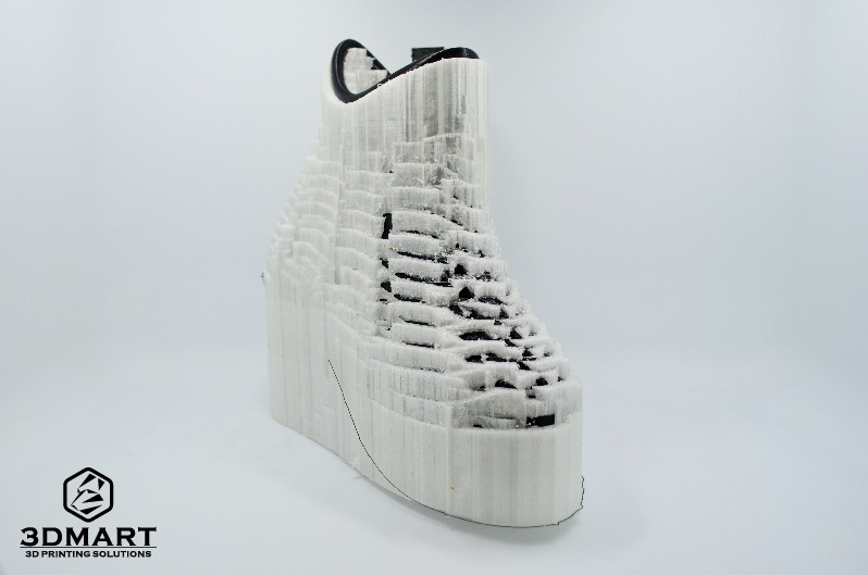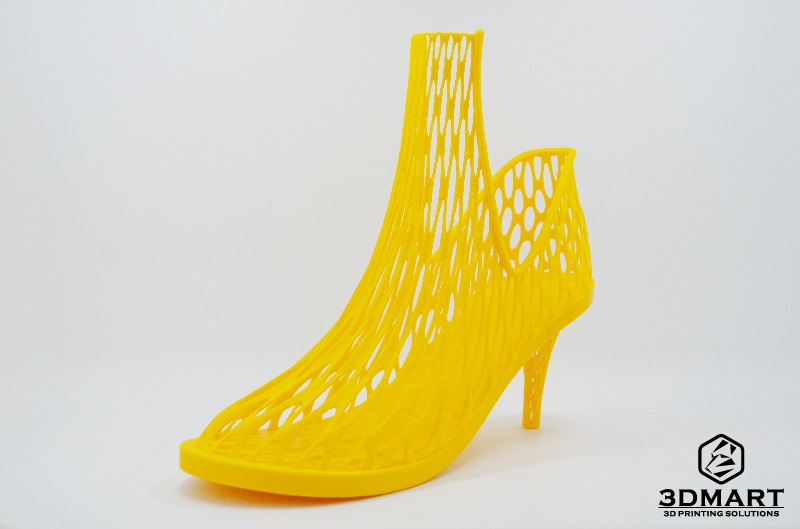 【3D列印應用】新潮設計3D列印鞋款 3D列印的應用方式非常多,像是公司開發商品原型時會利用3d列印技術,有些學校也會使用3d列印機來輔助生產 教材或完成學生的設計想法。 這次3DMart收到來自大學的工業設計系學生的3d列印代工委託,幫助完成他們的設計構想,他們剛好都是設計鞋 款,各具不同的特色,我們將於此篇文章向大家介紹他們的設計歷程。 第一個的黃色設計款女用鞋是李同學的作品,主要是為了畢業專題所製作的作業,設計的靈感結合樹根、骨骼密度 的造型以及網狀的血管,是一款十分優雅的新穎設計女士鞋款,鎖定25-35歲具時尚感的輕熟女族群 李同學表示會使用3d列印技術完成此鞋款,是因為此鞋子模型在造型上很複雜並且要求高細緻度,在製程上面選擇 3d列印機印製也比較簡單,並且在最終完成度也很高。 由於設計上有許多鏤空的部分,必須使用Ultimaker3雙噴嘴3d列印機,讓PLA搭配水溶性支撐材PVA,不須擔心有 拆不完的支撐以及支撐拆除後的粗糙表面。 在Cura的設定上我們盡可能地將PVA的用量調至最低,避免材料的浪費並節省泡水的時間,總共的列印時間約為2天。 圖為正在3D列印的黃色女用鞋 (列印層厚:0.15mm 填充率:30%) 這次決定設計鞋子作為畢業製作是來自老師的提議,由於聯合大學工設系所在工專時期是以鞋子設計為主要項目, 後來才轉變為以產品設計為主,此次有種想重拾初衷再次挑戰過去鞋子設計的強項。