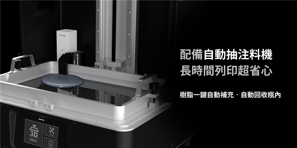 一鍵自動補充樹脂,輕鬆應對大模型的長時間列印,無需擔心樹脂不足;列印完畢後,樹脂自動回收至瓶內,清潔過程更方便、更省力。