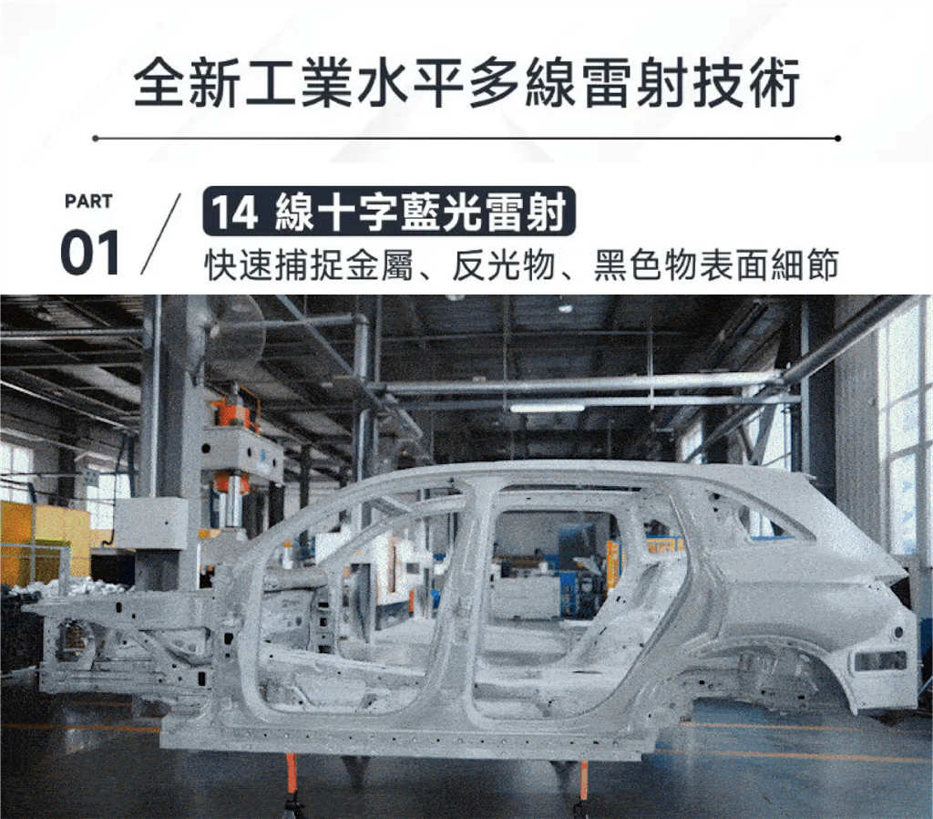 全新升級的工業級十字雷射,不止可以達到以往常見的掃描成果,更針對 平滑面、金屬面、無明顯特徵的物品 量身打造!