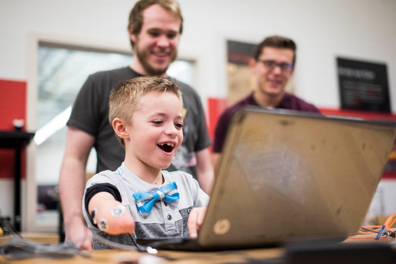 這款3D列印的義肢手臂上配置可偵測(cè)肌肉活動(dòng)的感測(cè)器,能自然抬舉手臂、自由活動(dòng)手指、提供抓握功能,不會(huì)因錯(cuò)誤使用肌肉而導(dǎo)致其他生長問題,例如:不對(duì)稱的姿勢(shì)、肌肉骨骼疼痛…等影響。