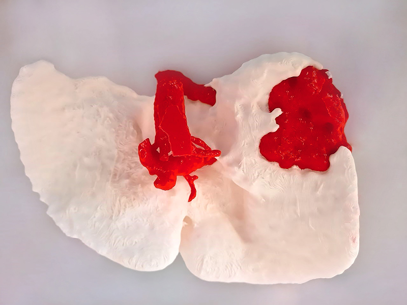 Mirai3D團(tuán)隊(duì)使用進(jìn)行雙色3D列印,製作肝臟、肝血管、腫瘤位置的模擬模型,醫(yī)生團(tuán)隊(duì)在進(jìn)行手術(shù)前,研究腫瘤和肝臟之間可能會(huì)產(chǎn)生的各種問(wèn)題,了解血管結(jié)構(gòu)後,得到最準(zhǔn)確的參考。