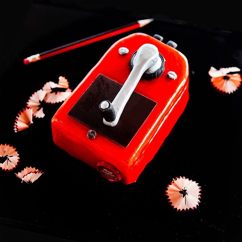 ,搭配通過食品安全認證的注塑片,在巧克力蛋糕上加入削鉛筆機的手把,不但融合了兒時的記憶,也以最低的成本嘗試各種想法,完成削鉛筆機的最終造型,再進行甜點小量生產!