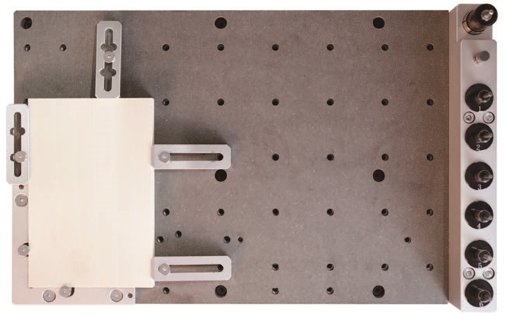2. 將環氧樹脂刀模板和廢料板固定到工作臺上,如圖所示。對齊到錨點1的L型支架。