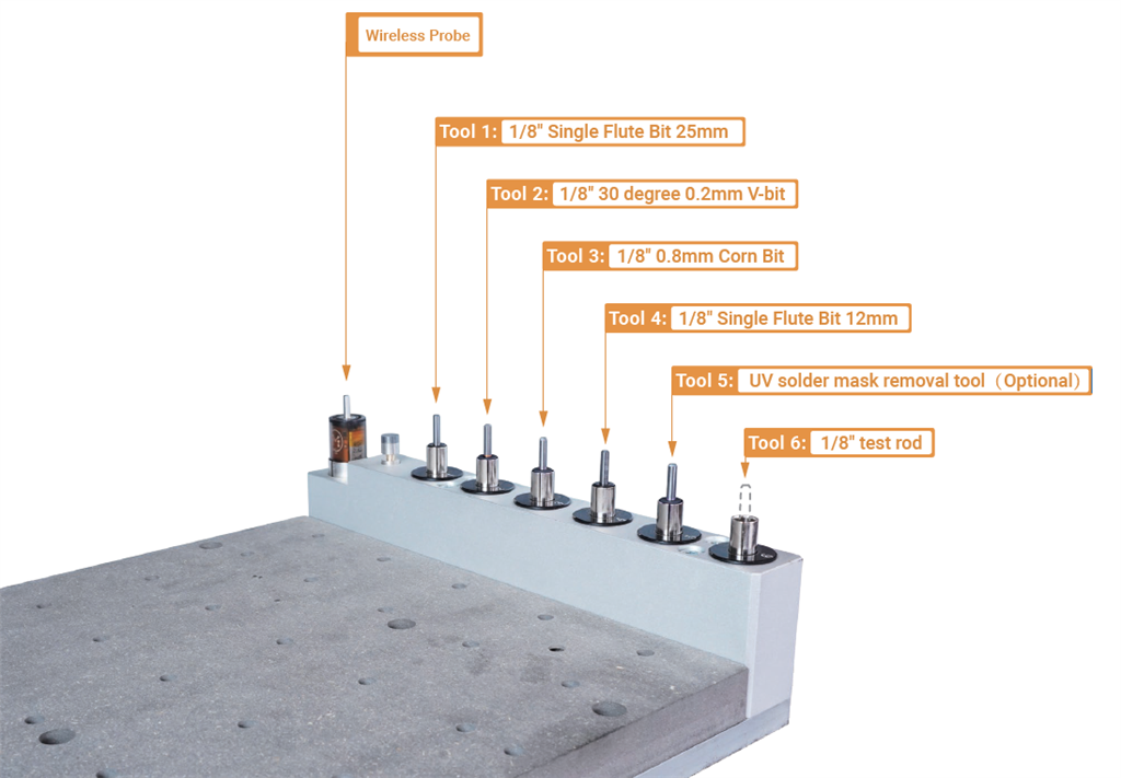 測試棒可以在附件箱中找到無線探針,工具箱中找到銑削刀片,並在 PCB 包裝中找到可選的Tool 5: UV銲錫遮罩去除工具。安裝的預設工具是Tool 6: 1/8英寸測試棒。
