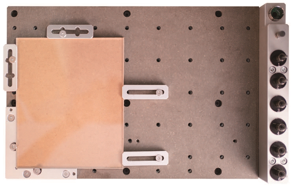 2. 取下頂部的保護膜。將壓克力板和廢板固定到工作臺上,如圖所示。對齊到錨點1的L型支架。
