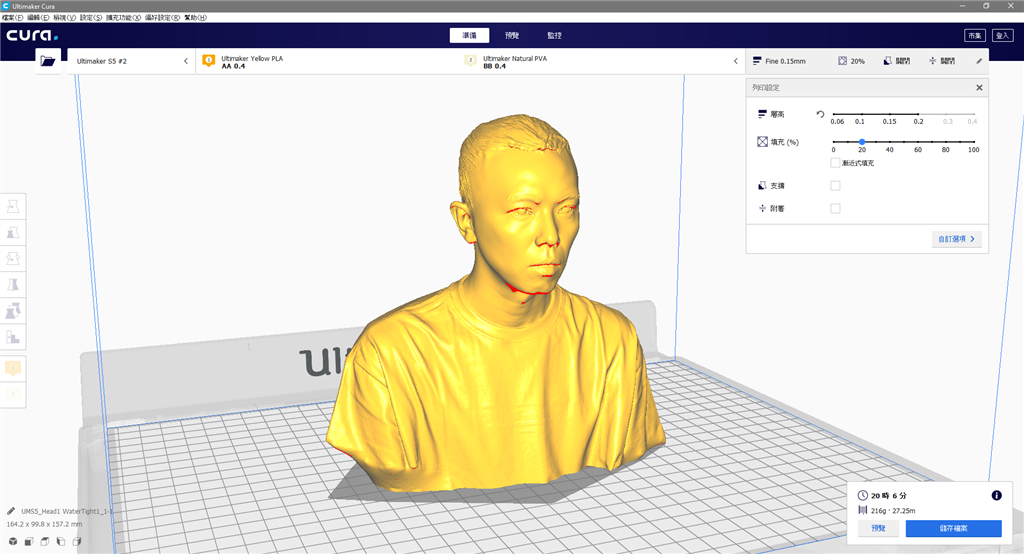 掃描完成後的STL檔案就能直接進行3D列印,免開模、更快速,同時能符合客製化商品的新需求及趕件交期,這裡直接丟進Ultimaker Cura讓大家看一下檔案效果。