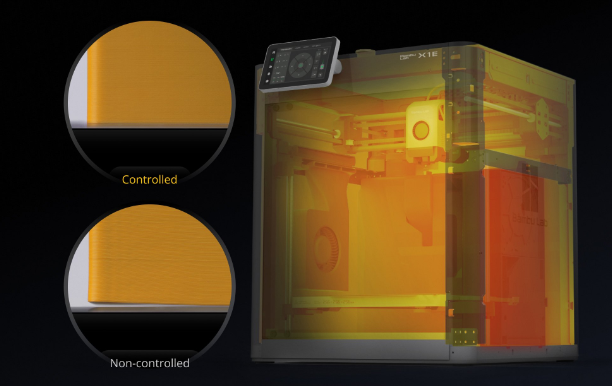 X1E 3D列印機(jī)為工業(yè)用途而設(shè)計(jì),同樣也有人工智慧演算法利用光達(dá)和電腦視覺(jué)來(lái)檢測(cè)第一層的瑕疵和炒麵誤差,並配有腔室溫度控制系統(tǒng)(高達(dá) 60°C 或 140°F),列印速度高達(dá)500 mm/s,擠出流量為32 mm³/s,具有0.1 mm的精度,相較X1C可列印的線材更廣泛,特別是PC或ABS材質(zhì)