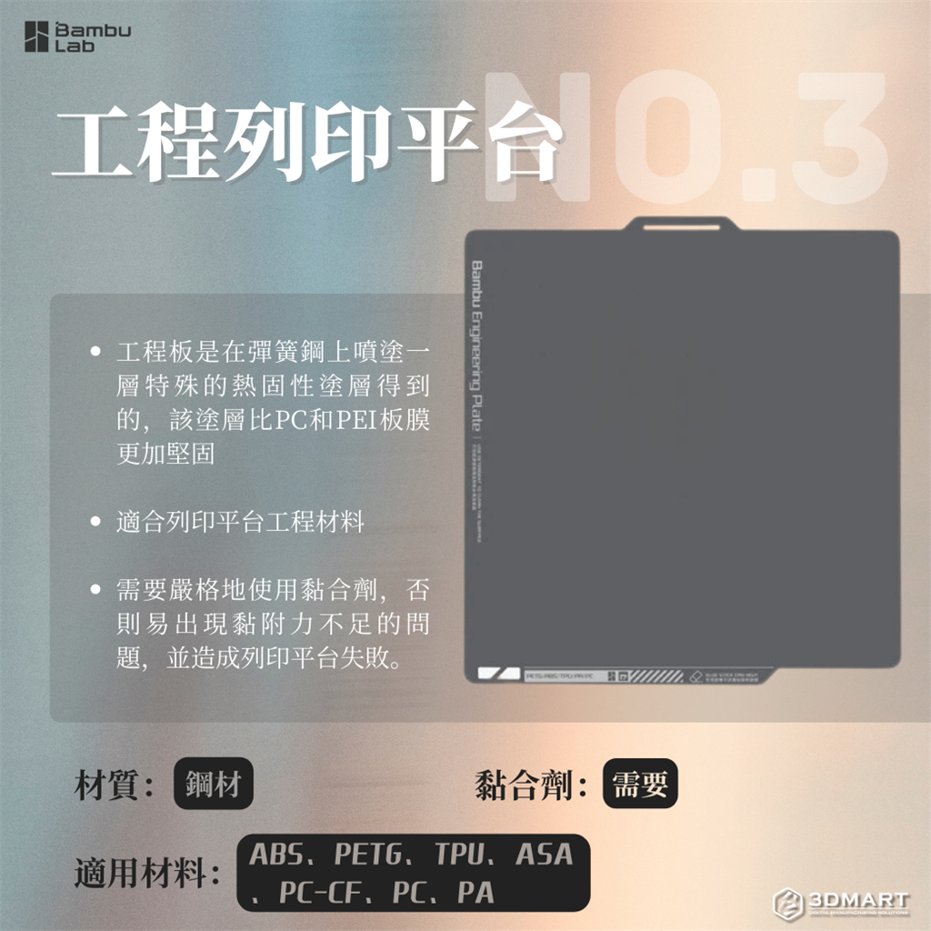3?? 工程列印平臺 工程板是在有彈性的鋼材上噴塗一層特殊的熱固性塗層得到的,該塗層比PC和PEI板膜更加堅固,非常適合列印平臺工程材料。 該列印平臺的不足在於列印平臺時需要嚴格地使用黏合劑,否則易出現黏附力不足的問題,並造成列印平臺失敗。 ??材質:鋼材 ??黏合劑:需要 ??適用材料:ABS、PETG、TPU、ASA、PVA、PC、PC-CF、PA等