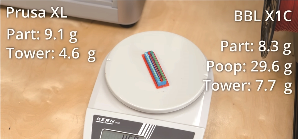 例如,透過我們最壞情況的測試(每層都需要更換三次工具的圓柱體),完成的列印件僅重 9.1 克,而擦拭塔則增加了約 4.6 克。