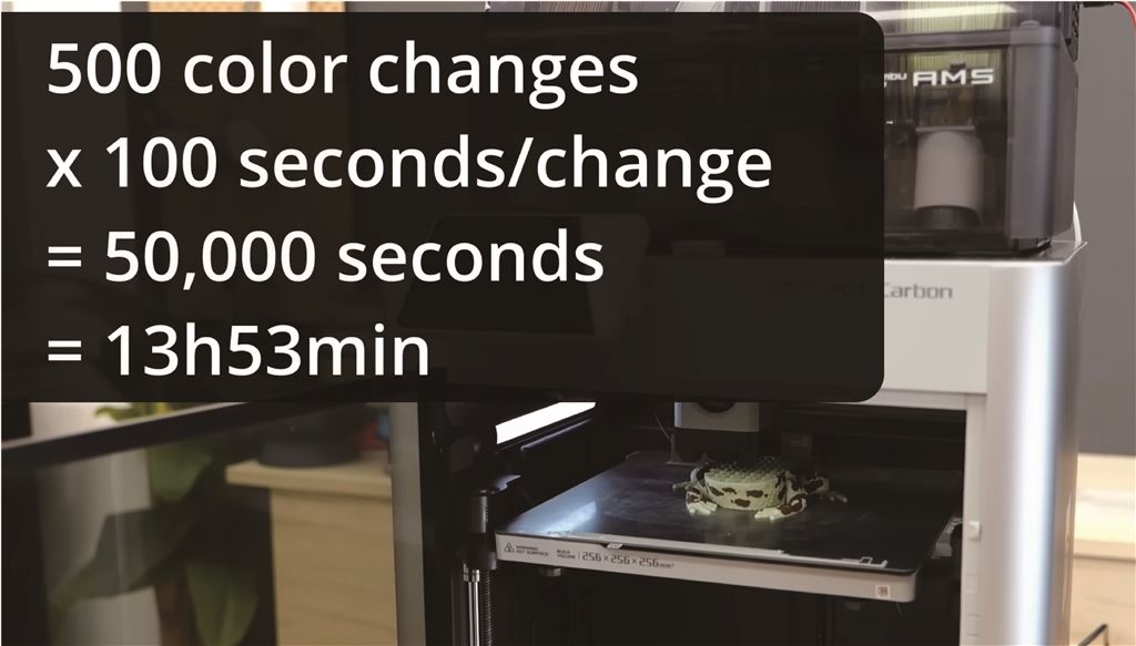 換個角度來說:如果你有 500 種顏色變化,每次平均需要 100 秒,也就是說光是切換顏色和產生廢物就花了近 14 個小時。
