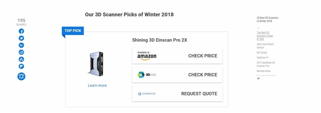 【3D掃描工程】All3DP全球最佳3D掃描器首選:EinScan Pro 2X All3DP是世界領先的3D列印雜誌,內容引人入勝且無論對於初學者或熟練的老手都有幫助;除了3D列印相關的教育和娛樂訊息外,更經常發佈具有公信力的全球3D列印產品評比。 EinScan Pro 2X也在剛結束的2018年冬季獲選為25種全球最佳3D掃描器指南的首選(比較內容包含性價比),在Ultimaker S5獲選為All3DP的2018秋季最佳雙噴頭3D列印機之後;再度證實了三帝瑪為顧客挑選3D列印產品的品質。 (圖片來源:All3DP網站2018冬季25款全球最佳3D掃描器評比) 現在就帶各位看這款最佳3D掃描器的使用方式及詳細功能有哪些: .EinScan Pro系列技術 EinScan Pro系列採用白光3D掃描技術來達成高精度和高速度,這種專業級系統可以利用良好的顏色紋理捕捉小至0. 03mm大至4米的物體;EinScan Pro 2X為該系列最新的手持式3D掃描器,更適用於中、小型物體,能在不犧牲精度的前提下完成高速3D掃描。 .四種3D掃描模式 EinScan Pro 2X提供手持式快速掃描、手持式高精度掃描和固定掃描模式(再分為搭配轉盤與否)。以搭配自動轉盤的做法使用EinScan Pro 2X進行手持式快速掃描,能快速捕捉雕像的立體3D圖檔,還可直接透過3D列印製造出另一個實體。 .兩種手持掃描模式 手持掃描分為快速或高精度模式,在快速掃描模式下,EinScan Pro 2X每秒可處理高達1,500,000點(30 fps)的速度;相比之下高精度掃描較慢,但能提供更無可挑剔的掃描精度,最高可達0.05毫米。 這兩種手持模式都可以透過在掃描物體上貼定位貼紙來提高準確度,讓最小點距離縮小為0.2mm,進而運算出高分辨率的3D數位成像。 .新系列升級版 同時發布的EinScan Pro 2X Plus是升級版,主要為提高掃描速度和準確性,具有更高的單次掃描範圍、點距離和掃描距離。雖然兩個3D掃描器的掃描精度和景深相同,但相較於基本的2X型號更適用於研究、設計藝術和文化遺產、工程和醫療保健等應用。 前一版的EinScan Pro系列當然也是非常好的選擇,也依然列在這25種最佳3D掃描器的名單裡,只是新出的Pro 2X更加超越舊版的名次。 EinScan-Pro +也是多功能的3D掃描器,可以捕捉大、小物體,總體而論,適合多用途的3D掃描情況,EinScan Pro 2X系列則更適合專業級的使用。 不愧是評選最佳的3D掃描器是不是很強大呢?如果各位有看過我們之前使用EinScan Pro Plus完成的掃描文章(延伸閱讀:逆向工程實測,怪獸與牠們的模型!),可以發現它的精度非常細緻完整,而新一代的EinScan Pro 2X系列功能又更加強大。另外我們除了提供掃描服務,而近期我們也會發佈相關實測,歡迎持續關注三帝瑪的第一手消息! 追蹤粉絲專頁、抓住3D技術:https://www.facebook.com/www.88778853.com/