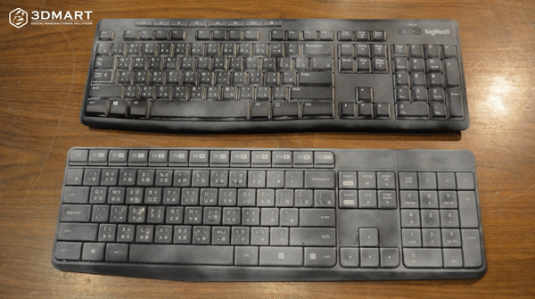 顯像劑的附著力、掃描效果,我們分別在鍵盤左邊噴上AESUB Orange 3D掃描噴粉,在右邊噴上