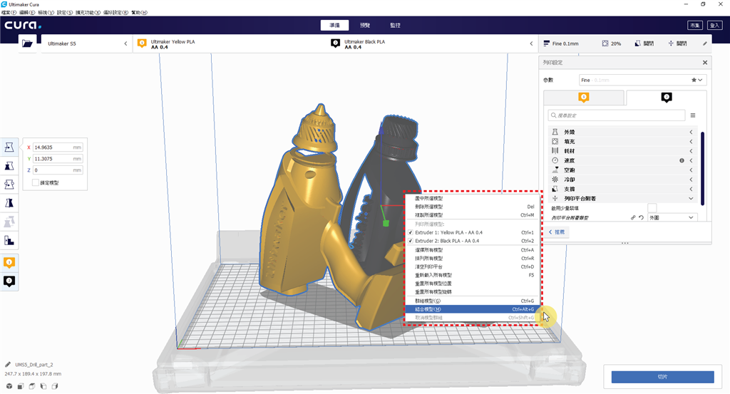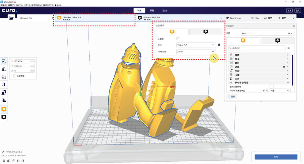這樣就大功告成,是不是很簡單呢!接著只要進行和平時3D列印一樣按右下角的「切片」進行運算即可,要注意的是在新版Ultimaker Cura中,切片運算期間無法同時進行參數調整,不然調整好的數值會遺失,建議都設定好再一次運算切片。