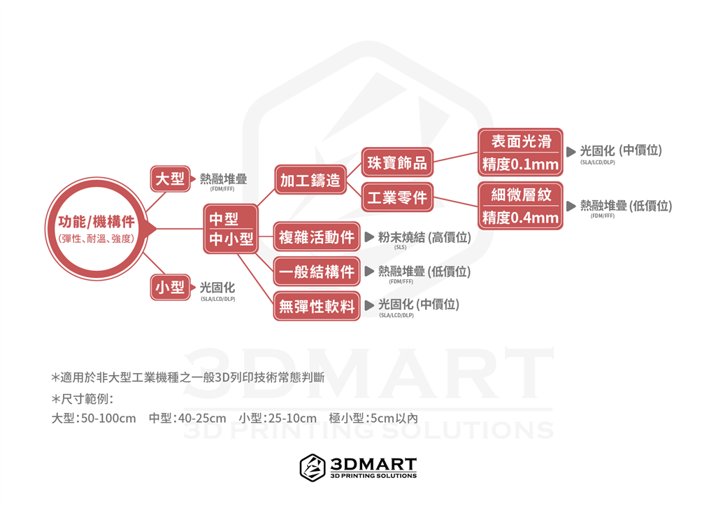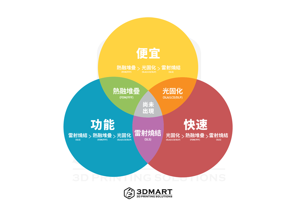 即使完全不了解3D列印技術的差別,只要知道大約有哪些選擇,並掌握自家物件的用途或外觀要求,就能大致判斷需要的方向,幫助快速選擇合適的應用類別。以市面最常見的3D列印技術來說,可分為熱融堆疊(FFF/FDM)、光固化(SLA/LCD/DLP)、粉末燒結(SLS):