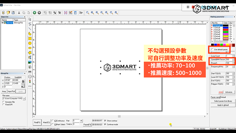 3. 調(diào)整功率、速度(不勾選預設參數(shù)),推薦功率:70-100/速度:500-1000
