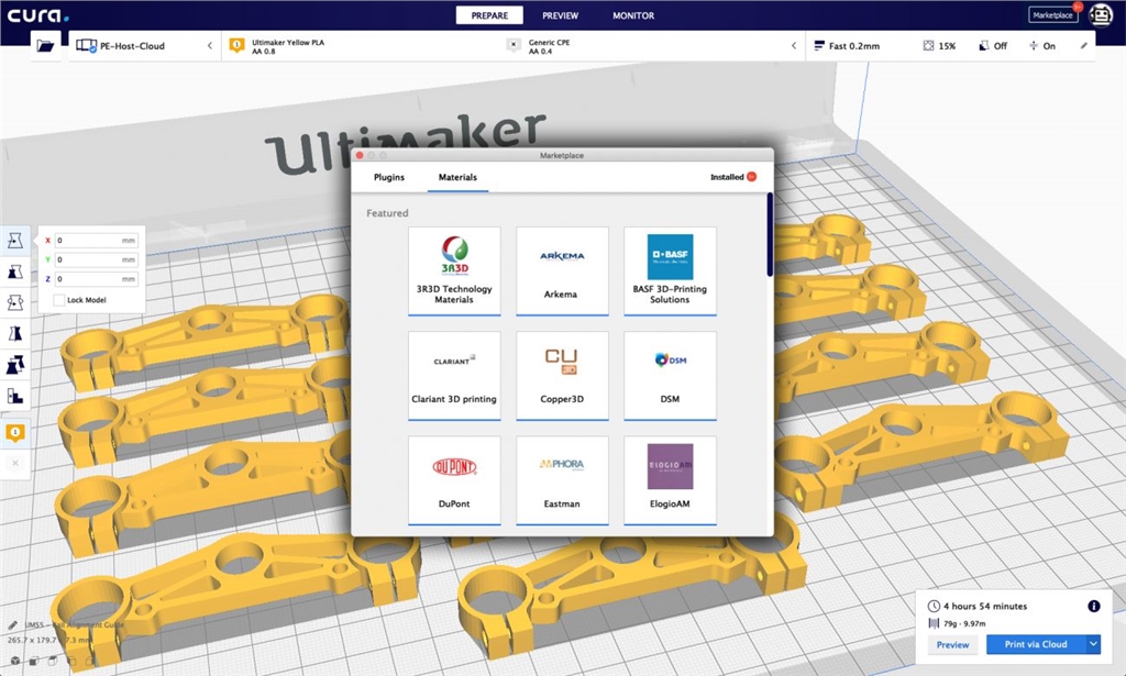 在Ultimaker 「市場」選項中與Ultimaker材料計劃的供應(yīng)商和參數(shù)文件相互連結(jié),更容易購買與使用所需的特殊材料。當(dāng)「市場」中的外掛或列印配置文件有更新時,「市場」按鈕和已安裝的外掛選項將會顯示通知圖示,讓你能隨時獲得最新版本及功能。