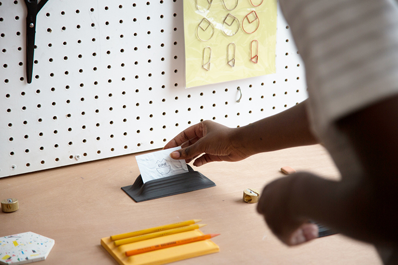 查理設計了一款擁有密集山脊紋路的「名片夾」,首先他使用雷射切割機,針對容易取得的材料(例如:木板、紙板、橡膠)進行切割,再將切片黏在一起就完成,細緻的階梯紋路生成超簡單!初步完成造型設計後,將物件放進真空成型機、搭配真空成型材料片,下壓3秒吸塑物件外型。