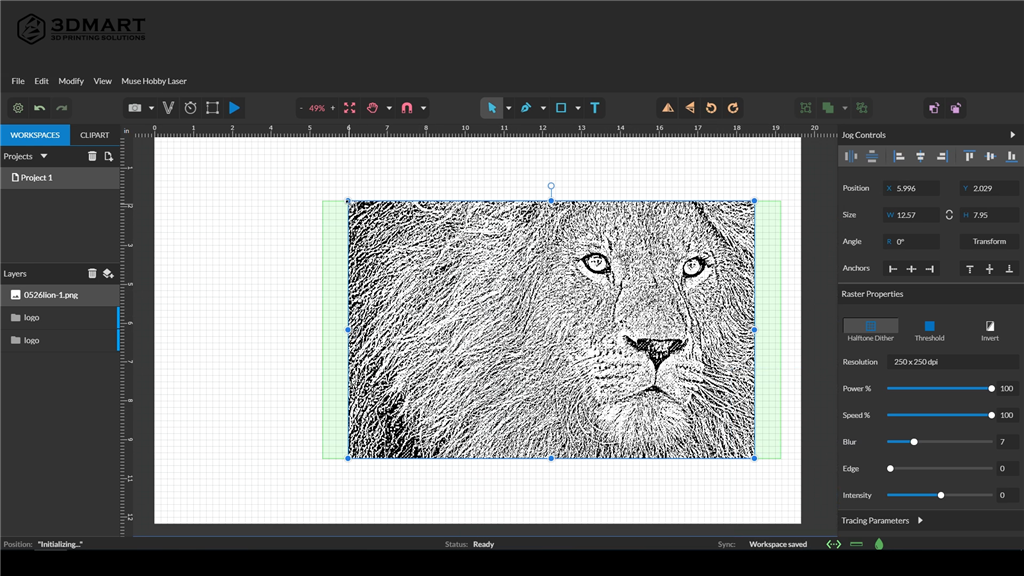 在MUSE專用的軟體RetinaEngrave中,除了能編輯圖片尺寸、位置,也可以針對解析度、功率、速度、模糊程度進階調整。