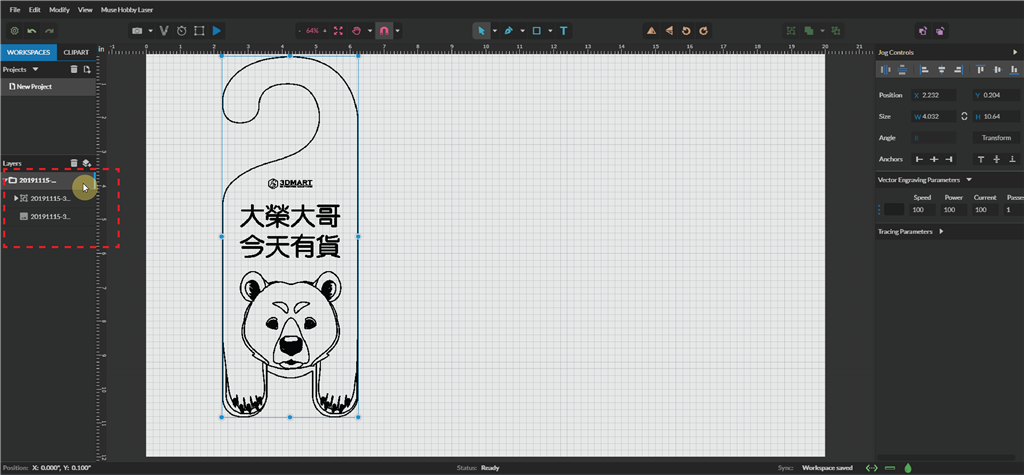 首先,可以用AI(Adobe Illustrator)軟體繪製喜歡的圖案或下載開源圖片,轉存為PDF格式後丟入MUSE的專業軟體「RetinaEngrave v3.0」。這個軟體不用下載,只需要將MUSE操控面板上的IP位址輸入到瀏覽器上就會自動開啟,並將剛才的PDF檔置入即可。