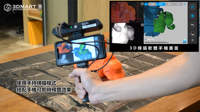 使用手持掃描模式,搭配手機(jī)可即時(shí)預(yù)覽效果,下方的行動(dòng)電源把手,可以直接連接至3D掃描器、手機(jī),不受限於連接線長度,隨時(shí)隨地皆可進(jìn)行3D掃描。(鋼鐵人掃描總時(shí)間:10分鐘)