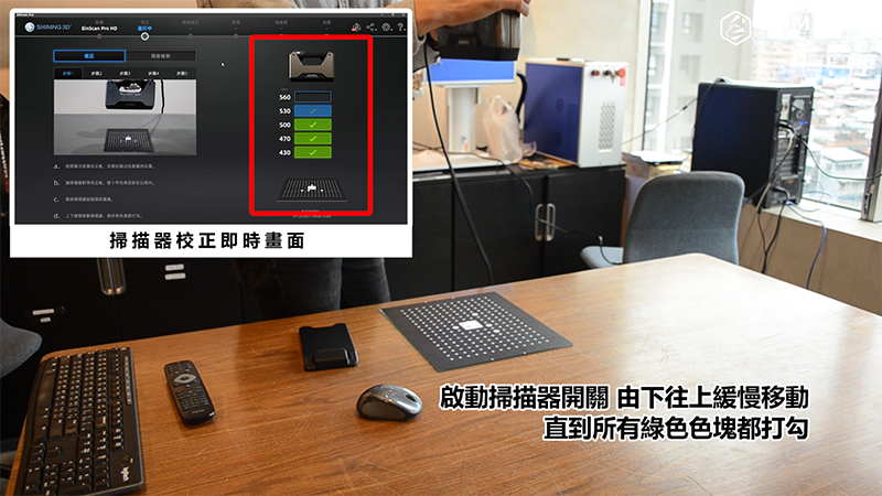 依照SHINING 3D掃描軟體的步驟,對準校正板進行校正,啟動掃描器開關,由下往上緩慢移動,直到所有綠色色塊都打勾;使用專用支架將校正板墊高,依照軟體中指示,接續進行校正。