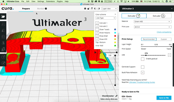 【3D列印快訊】Ultimaker Cura 3.2新版本發布! 測試階段已結束,我們非常有信心地要向您展示Ultimaker Cura 3.2的正式版。 在這個版本的Ultimaker Cura中,我們優化了用戶界面,以減少GPU對背面剔除的負擔,增加了新的UI元素, 允許在每個模型設置中創建網格物體,甚至只需加載即可進一步縮短啟動時間必要的資料。 繼續閱讀以了解更多新功能。 增強切片功能 自適應層 - 截至目前,切片被限制在一個固定的圖層大小。自適應圖層提供一種替代方法,其中圖層的列印厚度 與模型表面的角度配合。 切片算法將較窄的層厚分配給傾斜表面,並將較寬的層厚分配給垂直表面。達成高質量表面的處理結果,但需要 稍微增加列印的持續時間。該設定可以在實驗(experimental)的分類下找到。 可在「圖層視圖」模式中找到「圖層厚度」的顏色方案讓您能夠預覽列印的圖層厚度。 從黃色(最厚)到藍色(最窄)的顏色表示每層的相對厚度。 樹狀支撐 - 樹狀支撐是一種實驗的支撐方法,使用「分支」「生長」並向需要支撐的區域長出,模型上的接觸點更少 ,表面光滑度更好。使他成為有機品列印的理想選擇。也可以與其他支撐方法一起使用樹狀支撐。 樹狀支撐可用於有機體形成的物件。 UI元素 多層列印平臺。通過在軟體首選項中啟動多重列印平臺,可以在工作區中增加一個新的面板,使您可以在單個選單中 使用共享設定管理單獨的列印平臺。每個單獨的列印平臺會被加到Cura Connect的列印陣列中。 這解除了多次清除列印平臺的需要,以便更好地縮放操作,並更大限度地延長正常運行時間。 在單個選單中有多個列印平臺的切片檔案。 更快啟動 - 現在在增加列印機時就會載入列印機定義,不是在啟動時載入所有可用的列印機,與之前版本相比,減 少啟動的時間。 網格在每個模型設置 - 其他選項已加到每個模型的設定,提供簡化的方法來分配模型列印為網格。當處於自定義模 式時,可以將不同的切片設定分配到列印的不同部分,例如,一個網格作為自定義的支撐時,自動生成的支撐材料 不會放置在你不喜歡的地方。 下拉列表讓您可以指定網格的功能: 正常模型 (Normal model )- 將網格列印成正常模型。 列印成支撐(Print as support ) – 將網格列印為支撐材料。 不與其他模型重疊支撐(Don't overlap support with other models ) - 在網格重疊的區域不會生成支撐材料。 修改與其他模型重疊的設定(Modify settings for overlap with other models) - 將網格重疊的部分中列印網格以代替模型。 修改其他模型的填充設定(Modify settings for infill of other models) - 網格將在網格重疊的部分列印為填充。 修改其他模型的填充設定 這個登山扣是一個長方體網格切片,選擇「修改其他模型的填充設定(Modify settings for infill of other models)」。 網格跟分配給更密集的填充設定的其餘模型相比,能給重疊部分更大的耐用性。 背面剔除 - 通過只渲染模型的可見曲面,而不是渲染整個模型,讓層視圖在性能上更加提升。明顯提升了幀速率, 並降低了GPU的負荷。 更新側欄到QtQuick 2.0 - 應用程式欄位已更新成提升速度,更合適的寬度和風格,並為用戶提供下拉式選單,以配 合啟用的Ultimaker Cura主題,而不是操作系統的主題。 隱藏側邊欄 - 現在可以通過選擇View> Expand / Collapse Sidebar,或使用熱鍵CMD + E(Mac)或CTRL + E (PC和Linux)來隱藏或顯示側邊欄。這是為了擁有更寬廣的列印平臺,讓在小屏幕上顯示的列印平臺擁有更大的可 見性。 隱藏邊欄以獲得更好的視圖 禁用「發送切片訊息」- 在第一次啟動時增加禁用「發送切片訊息」的快捷方式,使需要隱私的用戶更容易保持切 片訊息的私密性。點擊禁用按鈕會將用戶帶到首選項(preferences),他們可以自行編輯首選項。 簽名的二進製檔案(Windows)- 對於安全意識的用戶,Windows安裝程序和Windows二進製檔案已經過數位簽 名,以防止“未知應用程序”警告和病毒掃描程序誤報。 每臺擠出機開始/結束gcode檔案-現在可以查看和編輯來自兩個擠出機開始與結束時變量的gcode片段,進而在不同 切片環境中的配置檔案裡建立一致性。 視圖查看優化- 3.1版中的快速攝影機控制鍵已經過修改,可以創造更精確的等距視圖,前視圖,頂視圖,左視圖 和右視圖。 快速相機控制 OctoPrint外掛加到外掛導覽器 - 這個外掛已經移動到外掛導覽器。這個外掛可以使用OctoPrint通過Ultimaker Cura 介面(版本 3.2 或更高階)來管理列印機。 修復錯誤 在我們社區的幫助下,我們修復了不兼容的鏡像工具和中心模型設定,修復了配置檔案位於遠端驅動器時的錯誤, 更新了Arduino驅動程序以防止更新為Ultimaker原始版本,並優化了自動排列所有模型選項,用於列印平臺上可靠定 位的多個小型模型。 現在就下載使用! 我們要感謝所有的測試者幫助我們測試這個版本,特別感謝fieldOfView的貢獻。 今天開始下載Ultimaker Cura 3.2探索它的好處! 原文連結:https://ultimaker.com/en/blog/52484-discover-ultimaker-cura-32