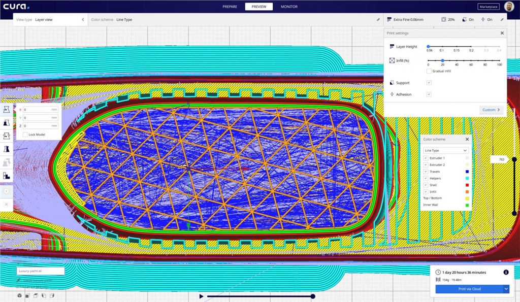 預覽視圖中的填充和支撐界面現在有新的配色選擇,可以更容易在複雜的模型中區分它們。填充線現在顯示為橘色,支撐界面則以藍色做出區別;這項功能在上方的「顏色方案」>「線條類型」中可以找到。