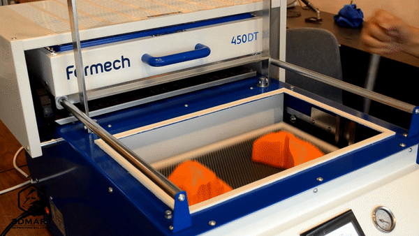 一切準備就緒後,將手柄往前下壓,工作平臺就會往上移動貼近材料片,這時候只要按下吸塑按鍵就能快速、不費力的完成
