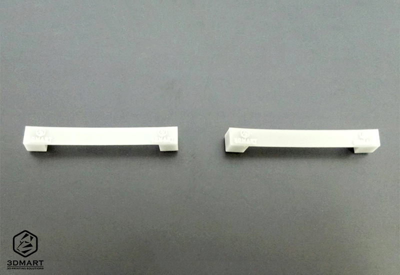 ,列印為中央1mm的超薄橋接式樣品;左邊是未使用紫外光後固化,右邊是加強固化後的成品。