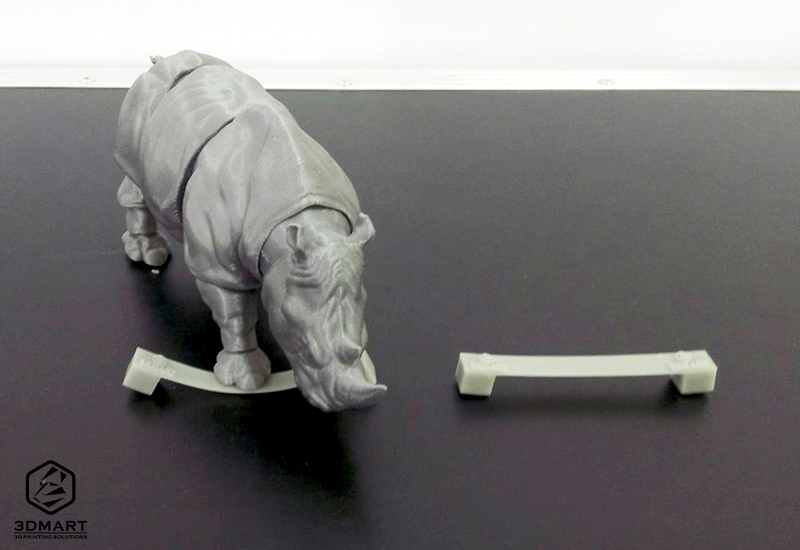 成品相對較軟,踩一腳彎曲的幅度會接近桌面;而右邊固化後的成品踩上去則是穩穩的撐住犀牛先生,只有微幅彎曲,硬度及強度都提升許多。
