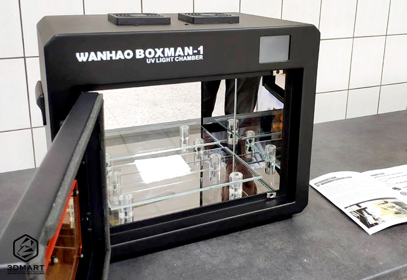 成品實際進行紫外光後固化,會看到箱內的UV LED燈亮起,也提醒各位請將UV燈關閉後再打開箱門,由於紫外線是電磁輻射的一種,應盡量避免接觸眼睛和皮膚。