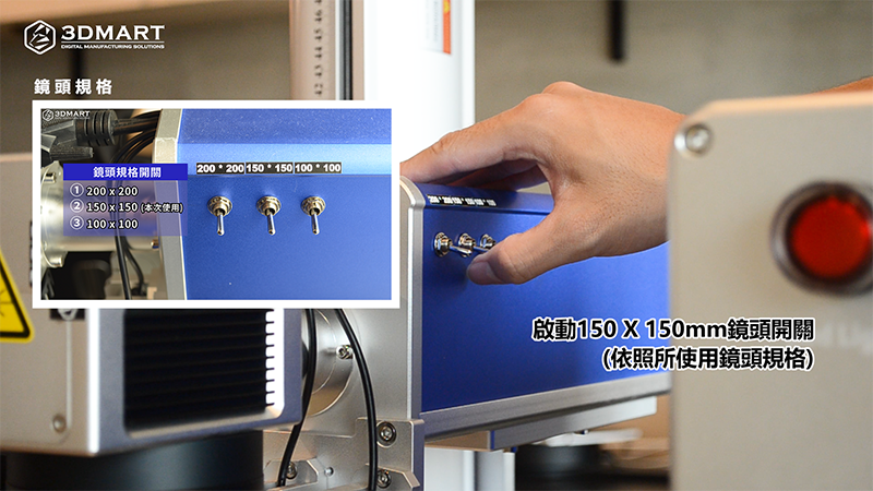將打標機側身的「鏡頭規格」,依照所使用鏡頭規格啟動(本次實測使用的鏡頭規格為150 x 150mm),接著使用內附的對焦量尺,在物件上方垂直量尺,量測基準線距離,旋轉上方轉軸,直到量尺達到指定定位。