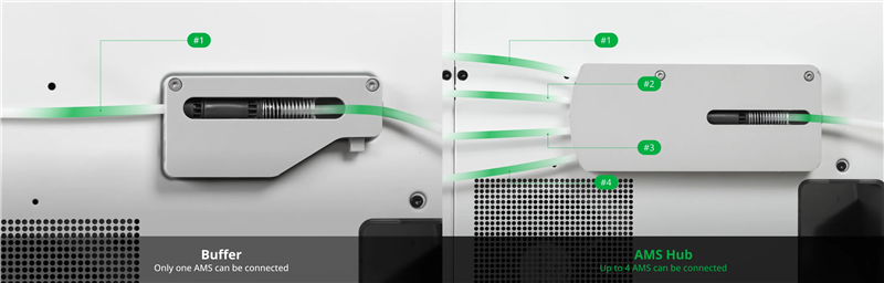 打印機的內置緩衝只能連接到 1 個 AMS。更換為 AMS Hub 後,打印機將能夠連接多達 4 個 AMS。