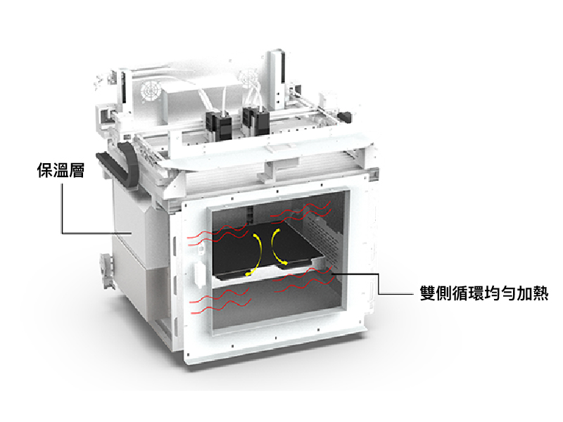 溫度最高達100℃,艙溫波動範圍小於5%,腔室溫度均勻分佈。確保列印時低內應力與良好的層間結合,減少列印過程中模型的熱變形和收縮,避免翹曲,實現真正的工程塑料大幅面全尺寸成型。