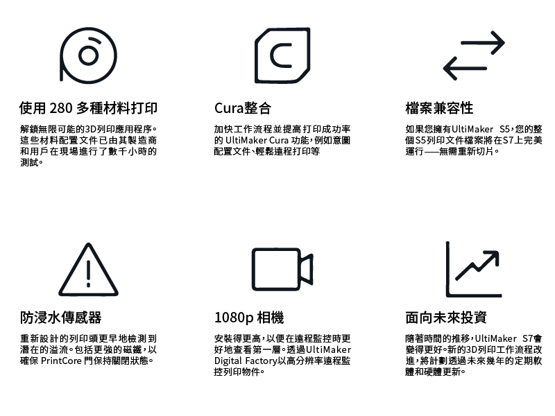 S7採用客戶們所喜愛並屢次獲獎的UltiMaker S5的一切,並更加完善。S7充滿了我們的最新技術,比以往更容易3D列印高品質的零件。